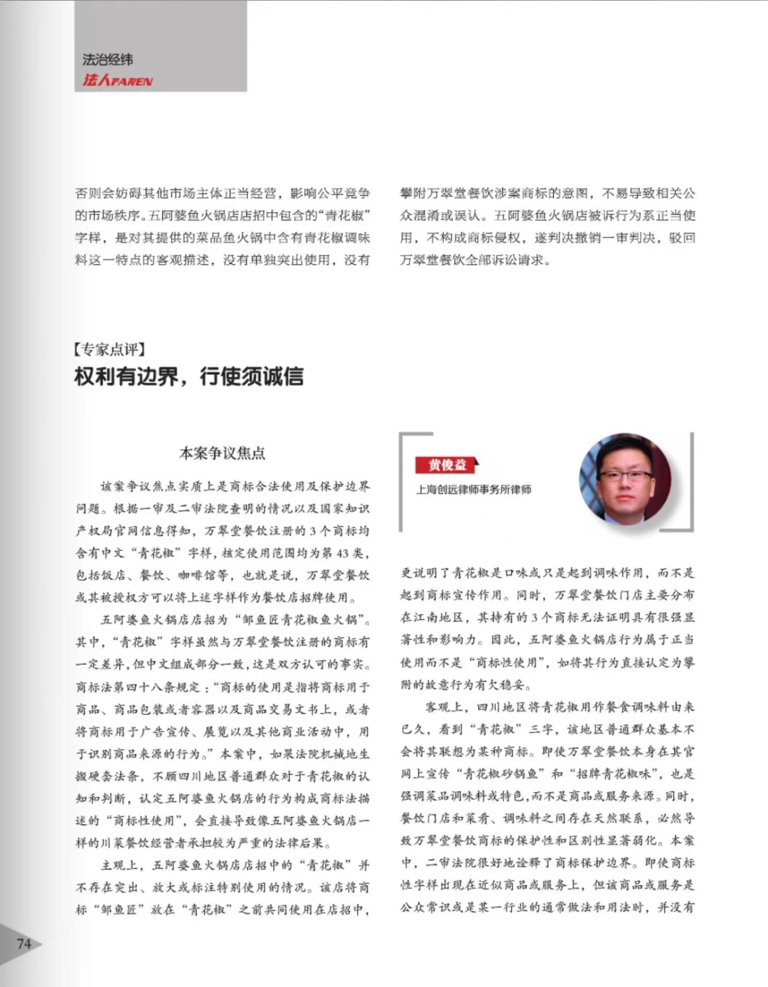 天津辉知简讯 | 辉知队黄俊益律师应“法治日报”旗下杂志邀请,就“青花椒”案发表专家点评